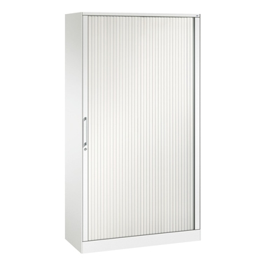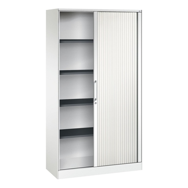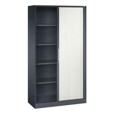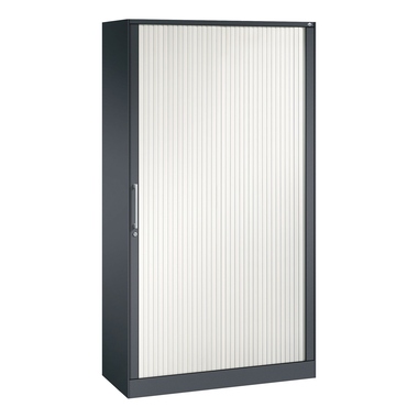 Stahl-Rollladenschrank Asisto. Korpus aus stabiler Stahlkonstruktion mit filigraner Kantenoptik und hochwertiger Einbrennbeschichtung für hohe UV-Beständigkeit. Mit integrierter Niveauregulierung, bequem von innen bedienbar. Hohe Flexibilität der Inneneinrichtung durch Höhenverstellbarkeit. 1 Abdeckplatte aus Stahl. Rollladen aus durchgehenden, flexiblen Kunststoff-Lamellen in Leichtlaufschienen, mit Aluminiumschlossleiste, rechts angeschlagen. 1 Ergonomischer Design-Bügelgriff für einfache Bedienung. 1 Wechselzylinder. Achtung: Anlieferungsmöglichkeit durch Sattelschlepper muss gegeben sein.