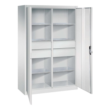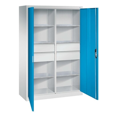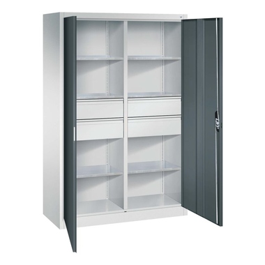 Werkzeugschrank Acurado, Korpus aus stabiler Stahlkonstruktion mit hochwertiger Einbrennbeschichtung für hohe UV-Beständigkeit. Mit Bodengleitern als praktischem Schrank- und Fußbodenschutz. Hohe Flexibilität der Inneneinrichtung durch Höhenverstellbarkeit im Raster. Türen mit geschlossenen Seitenprofilen und verdeckten Schließstangen für höchste Stabilität und Einbruchsicherheit. Mit Softanschlag. Türaufhängung in außen liegenden Scharnieren mit großzügigem Öffnungswinkel. Türen zueinander schlagend für gemeinsamen Verschluss. 3-Riegeliges Ergo-Lock Griffschloss für optimale Bedienungssicherheit und Verschleißfestigkeit, mit patentiertem Mechanismus: Zum Schließen einfach zudrücken. Achtung: Anlieferungsmöglichkeit durch Sattelschlepper muss gegeben sein.