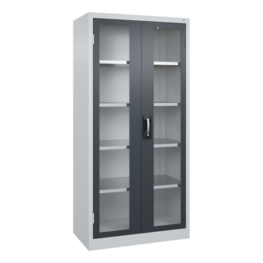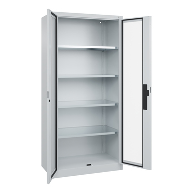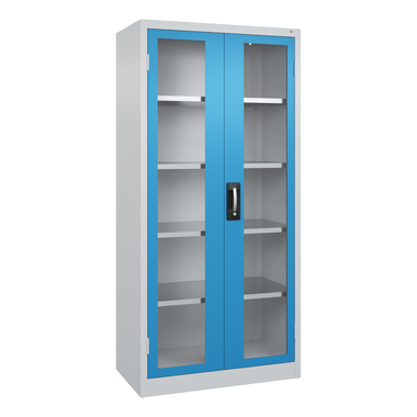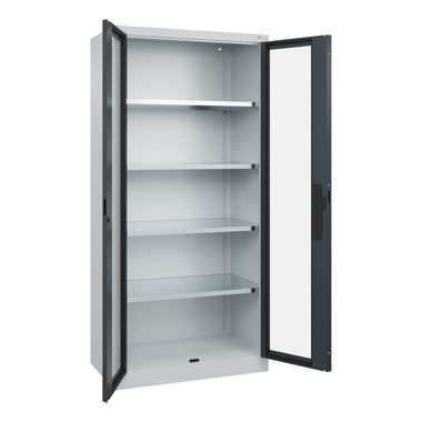 Werkzeugschrank Acurado. Korpus aus stabiler Stahlkonstruktion mit hochwertiger Einbrennbeschichtung für hohe UV-Beständigkeit. Mit Bodengleitern als praktischer Schrank- und Fußbodenschutz. Hohe Flexibilität der Inneneinrichtung durch Höhenverstellbarkeit im Raster. Türen mit Sichtfenster aus Acrylglas für direkten Einblick. Türen zueinander schlagend für gemeinsamen Verschluss. Geschlossene Seitenprofile und verdeckte Schließstangen für höchste Stabilität und Einbruchsicherheit, mit Softanschlag. Türaufhängung in außen liegenden Scharnieren mit großzügigem Öffnungswinkel. 3-Riegeliges Ergo-Lock Griffschloss für optimale Bedienungssicherheit und Verschleißfestigkeit mit patentiertem Mechanismus: Zum Schließen einfach zudrücken. Achtung: Anlieferungsmöglichkeit durch Sattelschlepper muss gegeben sein.