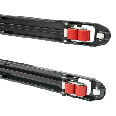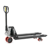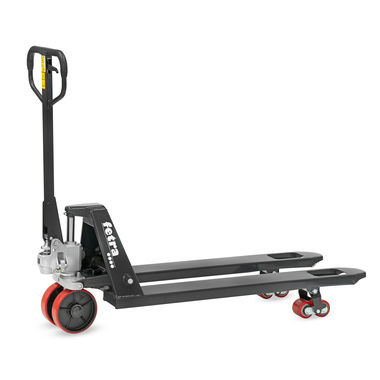 Profi-Ausführung für den täglichen Einsatz, robust und langlebig. Rahmen und Gabel in verwindungsfreier Schalenbauweise. Schmiernippel an den Drehpunkten, Schubstangen verstellbar. Mit reflektierenden Logo-Aufklebern. Ein- und Ausfahrrollen an den Gabelspitzen. Aufschraubbare Hydraulikeinheit mit verchromtem Kolben, wartungsfrei gelagert. Ergonomische Stahlrohrdeichsel mit Gegenlager für Schubbetrieb. Griff gummiummantelt. Leicht dosierbarerer Einhand-Bedienhebel für die Funktionen Heben - Fahren - Senken. Lenkeinschlag 2 x 102,5 °.