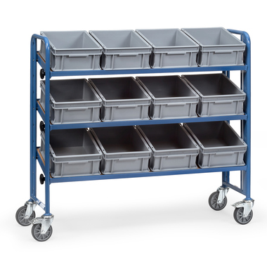 Anzahl der Etagen 3 Etagen Anzahl der Lenkrollen 4 Lenkrollen, 2 feststellbar Garantiedauer 10 Jahre Maße der Ladefläche 41,5 x 124 cm (B x L) Maße 47,7 x 119,7 x 135,5 cm (B x H x T) Gewicht 58 kg Tragfähigkeit des Fachbodens 60 kg Tragfähigkeit 250 kg Höhe der Etagen 370, 670, 970 mm Farbe des Gestells blau Farbe buche Material des Bodens Holzwerkstoffplatte Ausführung der Lieferzusammenstellung inkl. 12 Eurokästen (300 x 145 x 400 mm) Made in Germany Made in Germany Art der Oberfläche pulverbeschichtet Material des Gestells Stahl Material Reifen TPE Kunststoff Werbliche Produkttypbezeichnung Transportwagen Produktkategorie Transportwagen Ausführung der Bereifung Vollmaterial