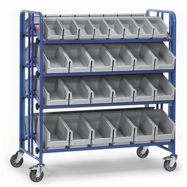 Stahlrohr- und Profilstahlgeschweißt,. Schraubkonstruktion. 4 zweiteilige Etagen. Rand 12 mm hoch. Variabel einschraubbare Etagen. Einschraubraster 100 mm. Neigung stufenlos einstellbar von 0° bis 35°. Sichere Arretierung mittels Griffschrauben. Naben mit Rillenkugellager.