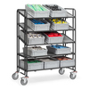 Eurokastenwagen im Baukasten-System: Stahlrohr und Profilstahl geschweißt. Schraubkonstruktion. 5 Etagenrahmen, Rand 13 mm hoch. Variabel einschraubbare Etagen, Raster 100 mm, Neigung bei schrägem Einbau 15° oder 30°. Naben mit Rillenkugellager.