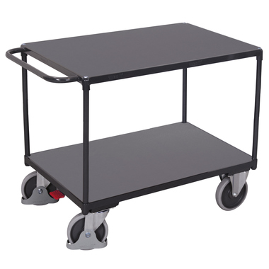 Der schwere Tischwagen mit Ladeflächen bietet ein flexibles Baukasten-System mit besonders robuster Bodenkonstruktion im innovativen L-Profil. Die bündigen Ladeflächen aus oberflächengeschützten Holzwerkstoffplatten sind dauerhaft schlag- und kratzfest. Spurlos laufende Räder aus thermoplastischem Gummi mit Präzisions-Rillenkugellager, Faden- und Fußschutz sowie 2 Lenkrollen mit patentiertem EasySTOP-Bremssystem sorgen für maximale Sicherheit und hohen Bedienkomfort.